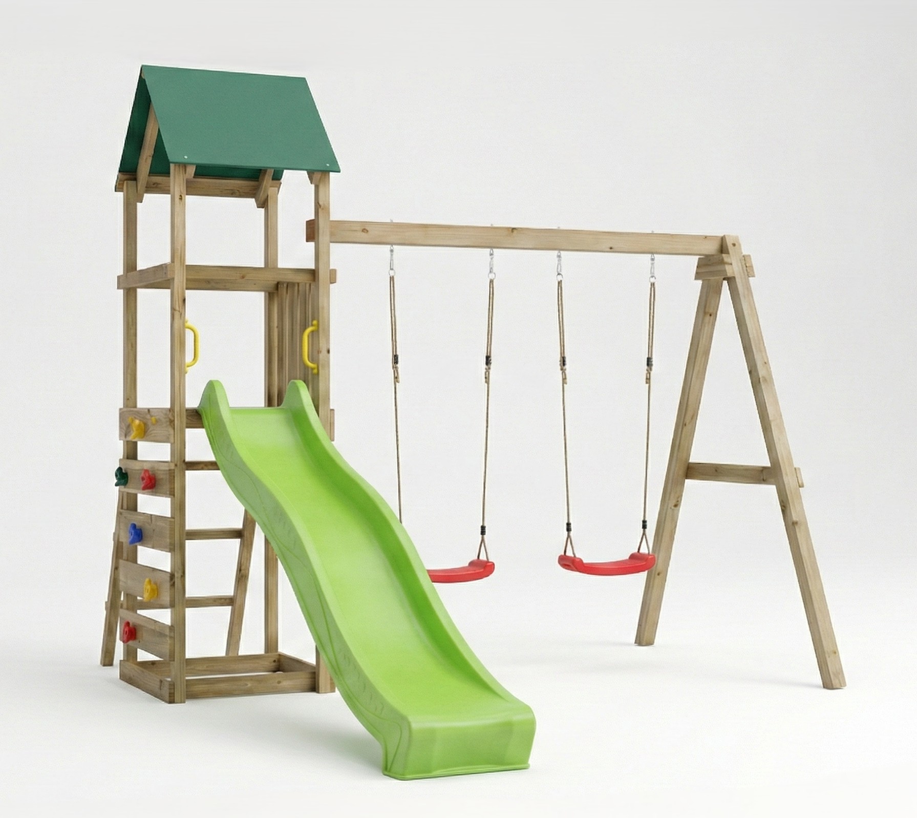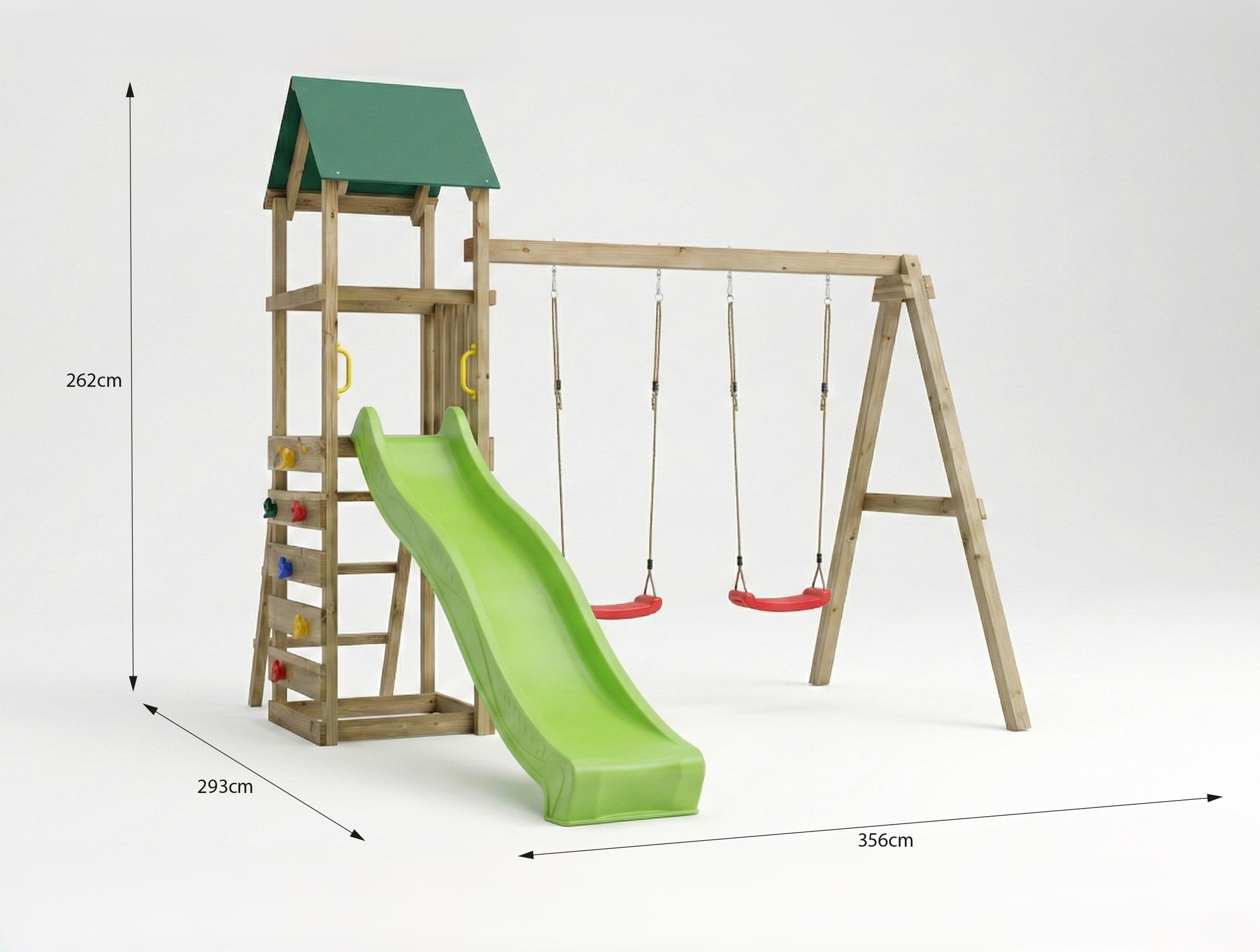 - Kurzinfo: Spielturm MaxPlay 2.1 aus Holz mit Doppelschaukel, Kletterwand, grüner Rutsche, Schaukelsitze und Bodenanker, Holz ist Kesseldruckimprägniert, Länge der Rutsche: 220 cm