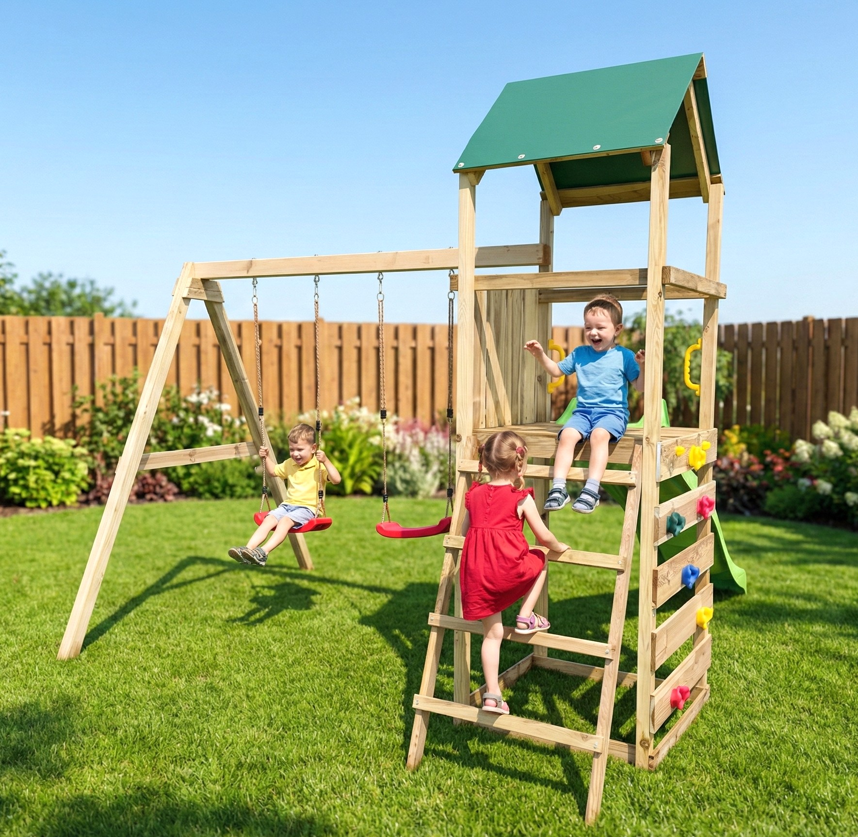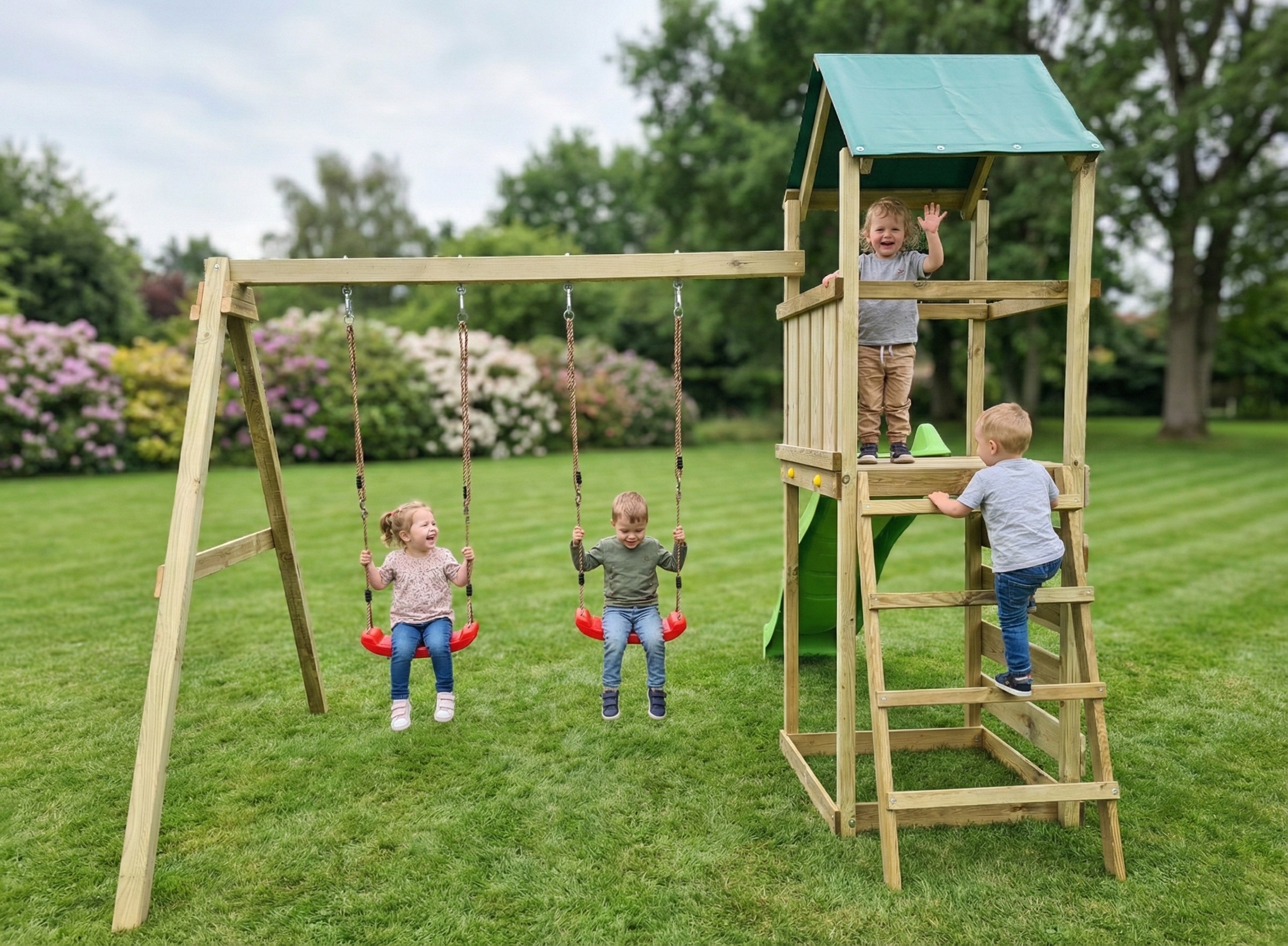 - kompletter Bausatz aus Holz für den Spielturm und die Doppelschaukel