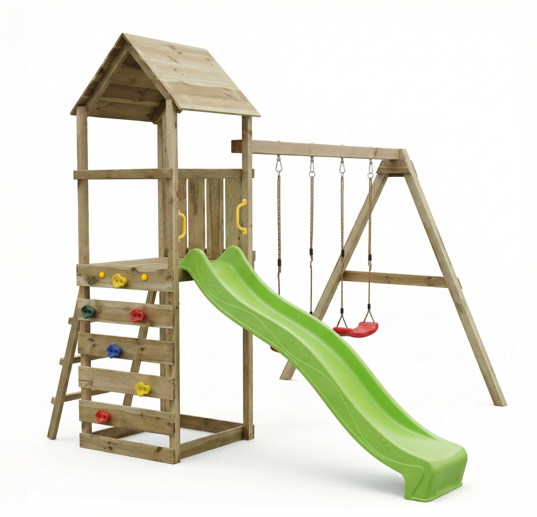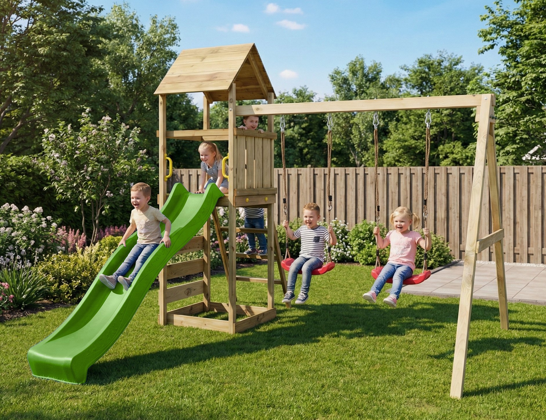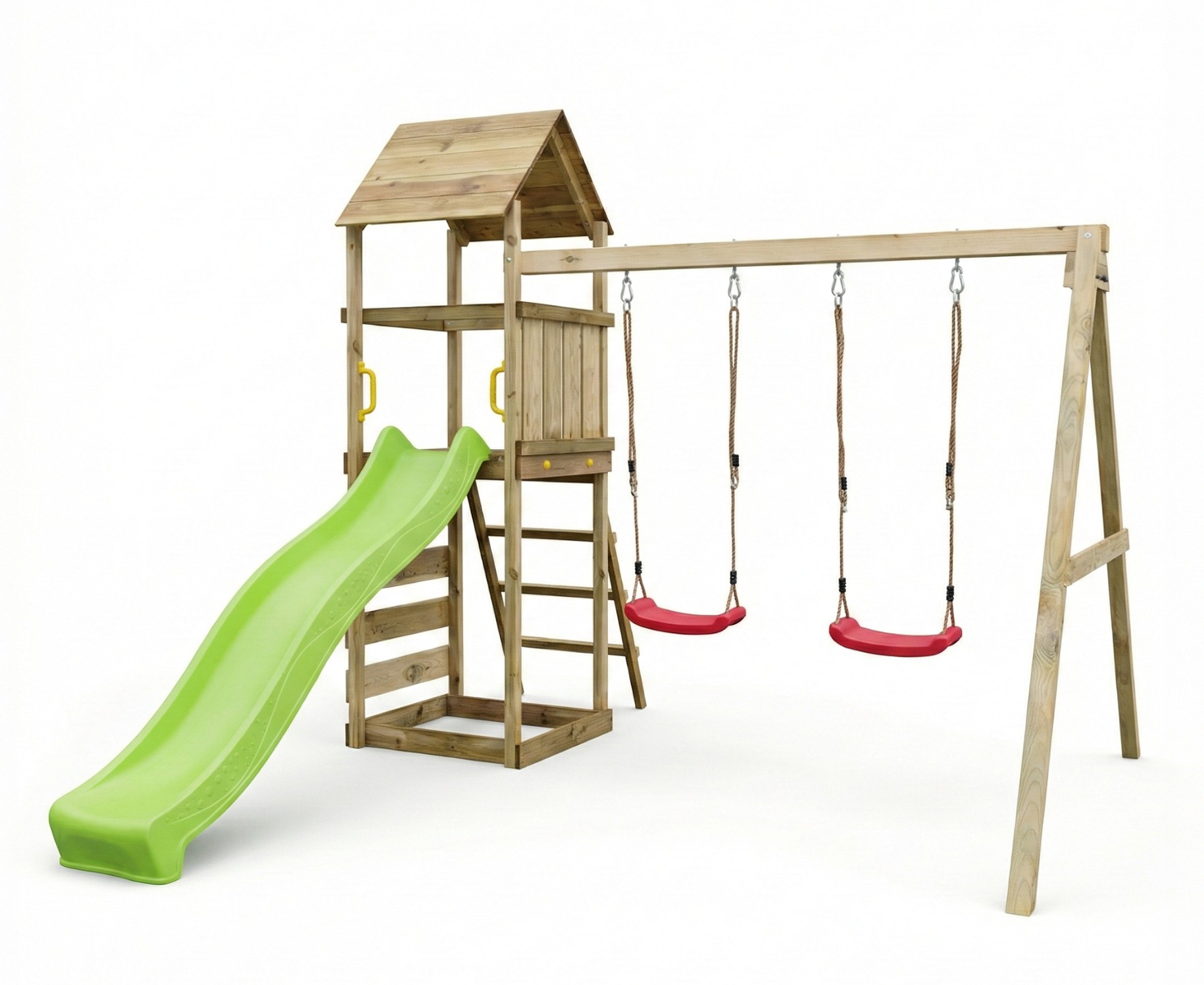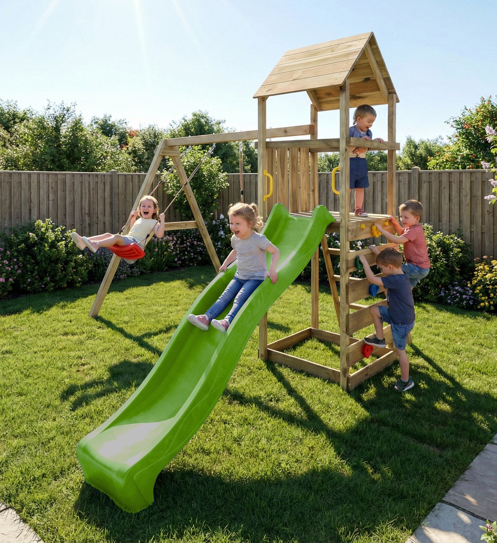 Fungoo Kinder Spielturm MaxPlay 2.1 aus Nadelholz mit Holzdach und grüner Rutsche, Leiter, Kletterwand, Doppelschaukel und Schaukelsitze, ist ideal zum Klettern, Toben oder zum Rutschen im Garten. Der Spielturm wird mit Holzmaterial und den dazu benötigten Teilen geliefert.
