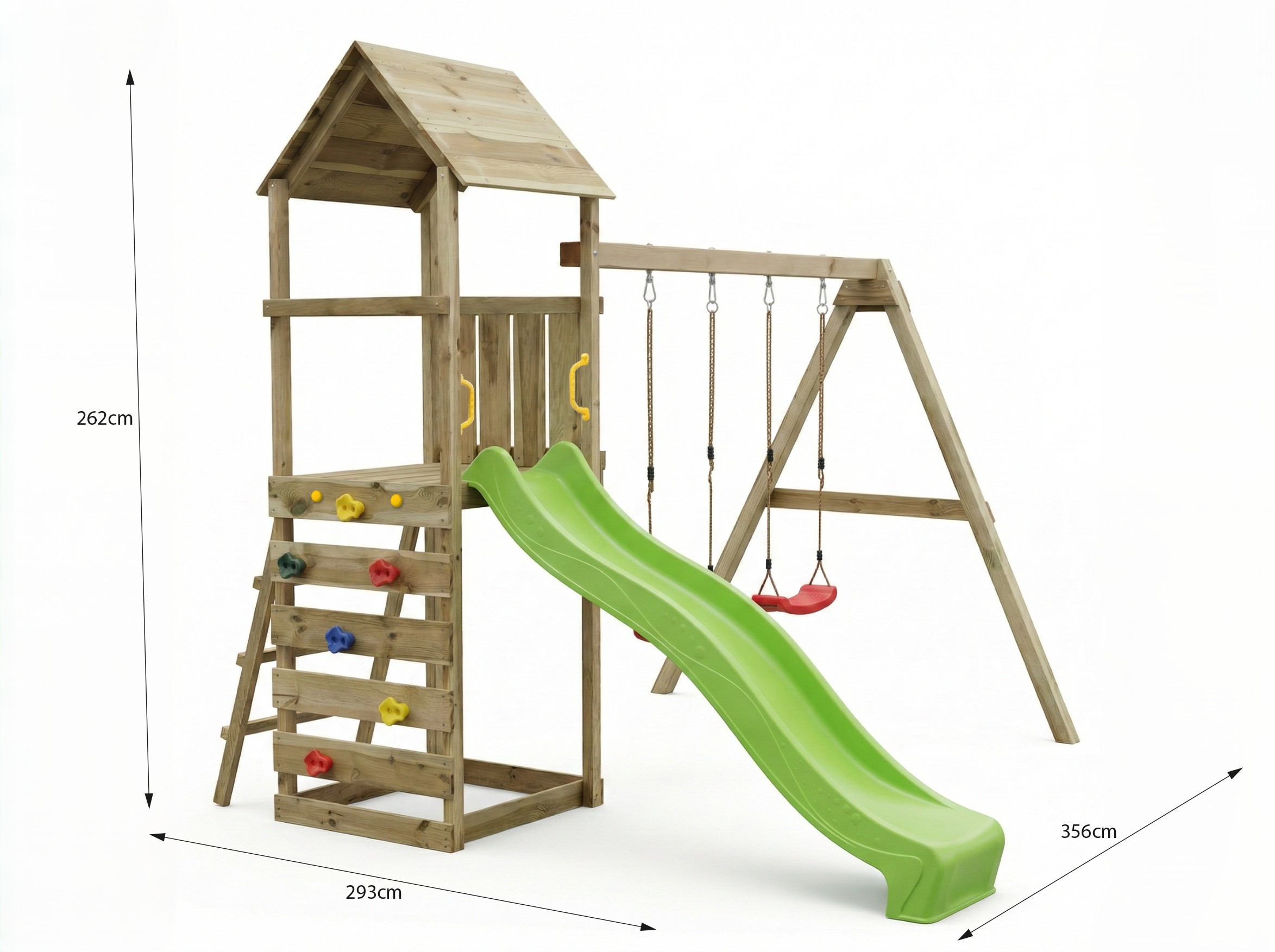 - Kurzinfo: Kinder Spielturm MaxPlay 2.1 aus kesseldruckimprägniertem Holz mit Holzdach, Doppelschaukel, Kletterwand, grüner Rutsche, Leiter, Schaukelsitze und Bodenanker, Länge der grünen Rutsche: 220 cm, Aufbaumaße: B x L x H: 356 x 293 x 262 cm, Schaukelbalken oben Stärke: 9 x 9 cm, Podesthöhe Spielturm: 120 cm, Größe Plattform Spielturm: 80 cm x 80 cm
