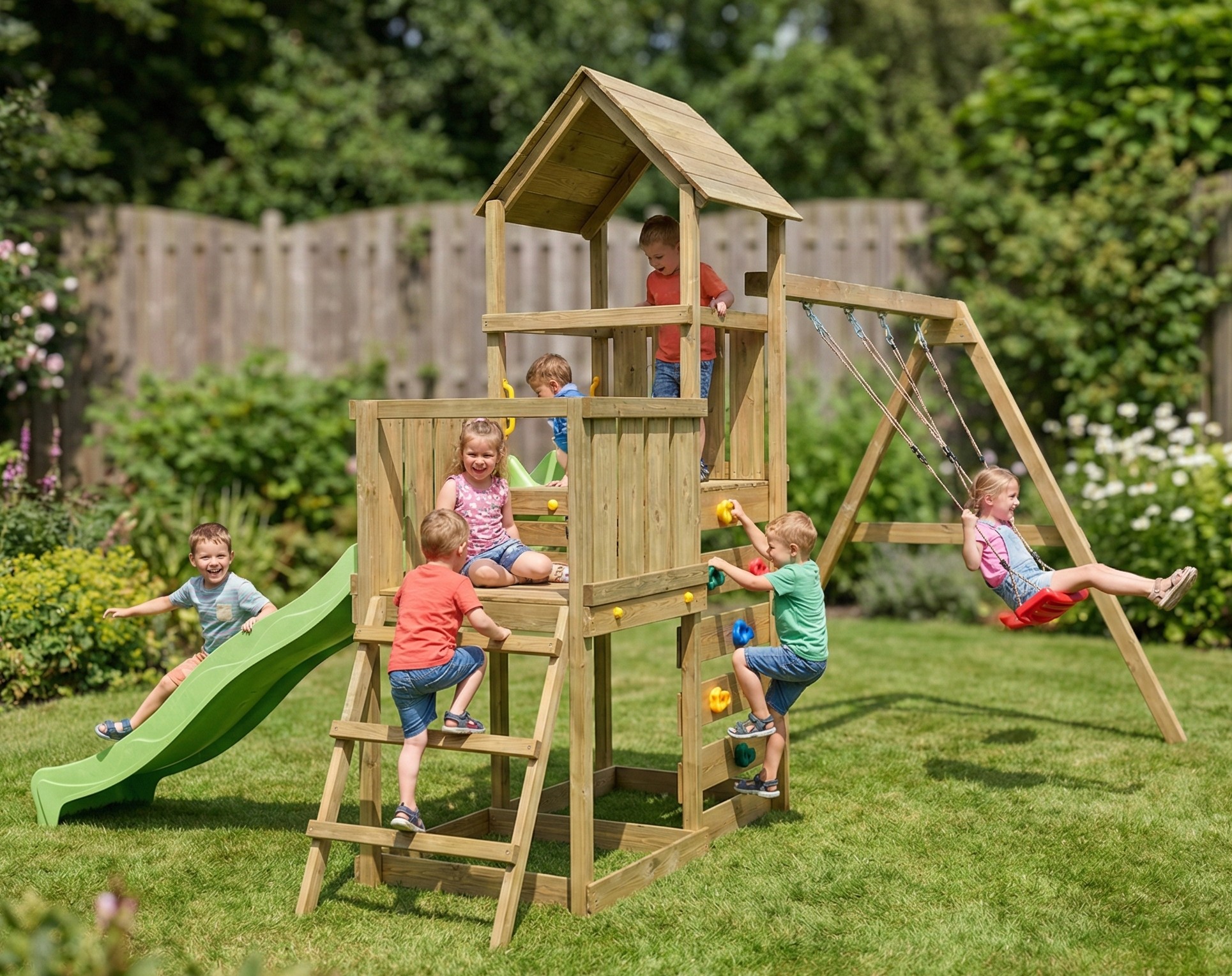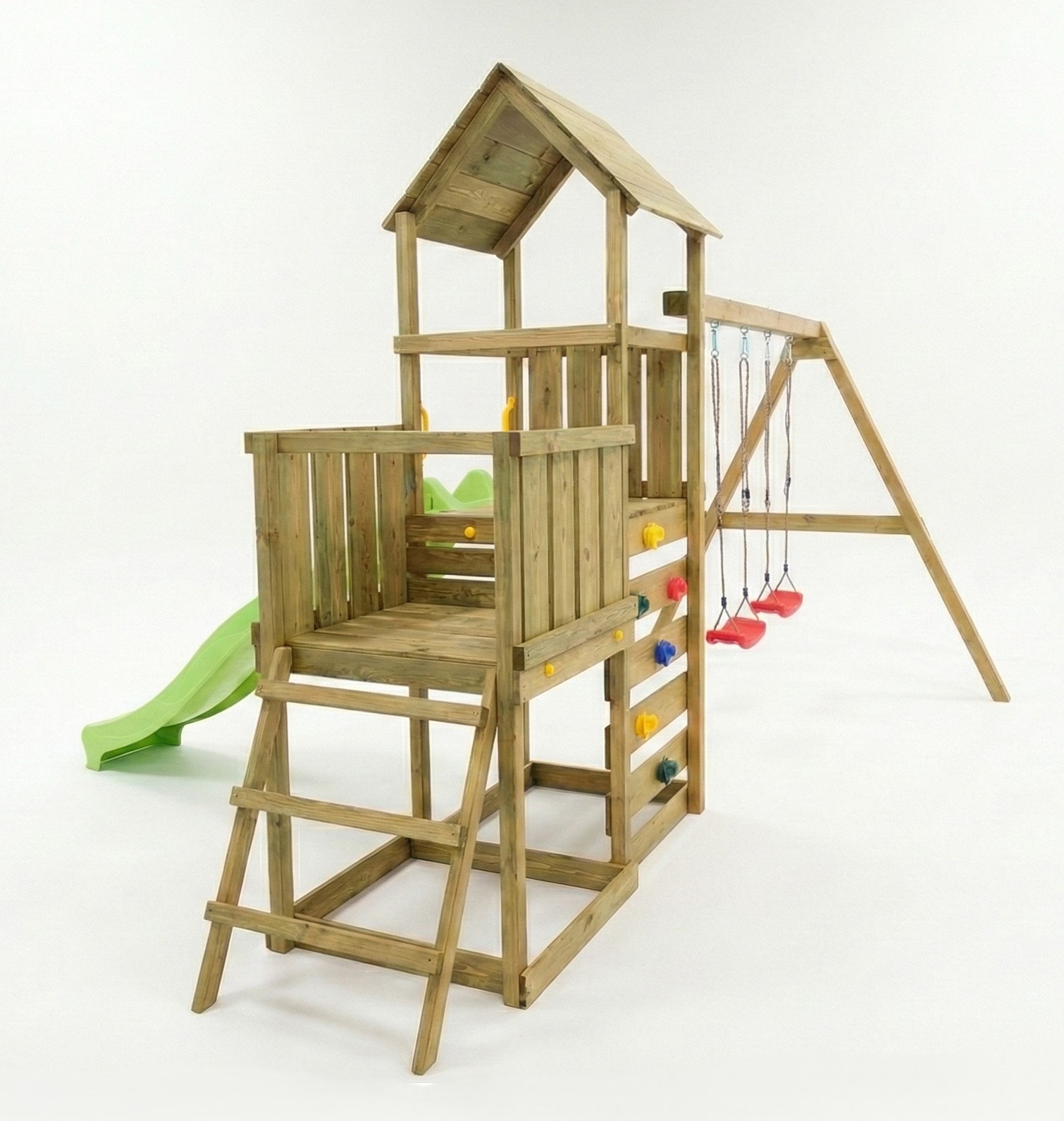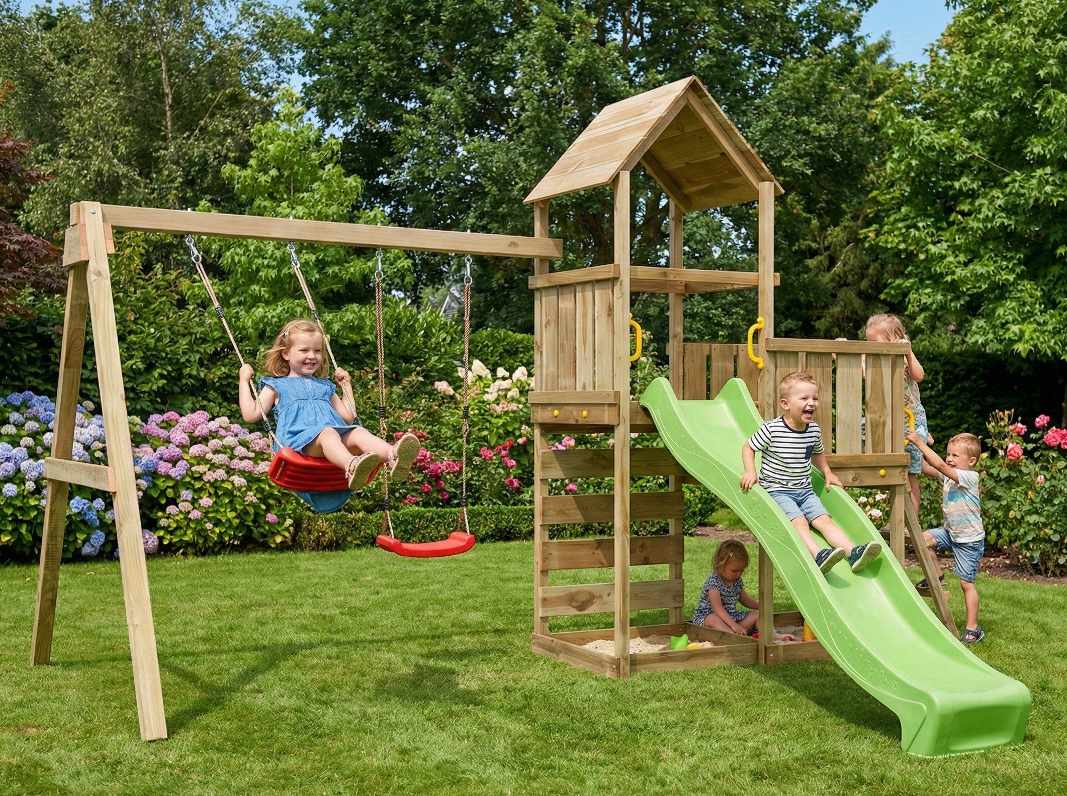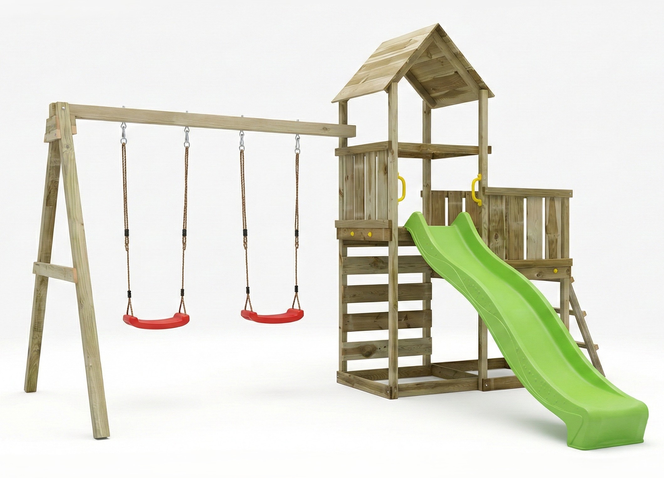 Fungoo Kinder Spielturm MaxPlay 3.2 aus Nadelholz mit 2 Podeste, Holzdach und grüner Rutsche, Leiter, Kletterwand, Doppelschaukel und Schaukelsitze, ist ideal zum Klettern, Toben oder zum Rutschen im Garten. Der Spielturm wird mit Holzmaterial und den dazu benötigten Teilen geliefert.