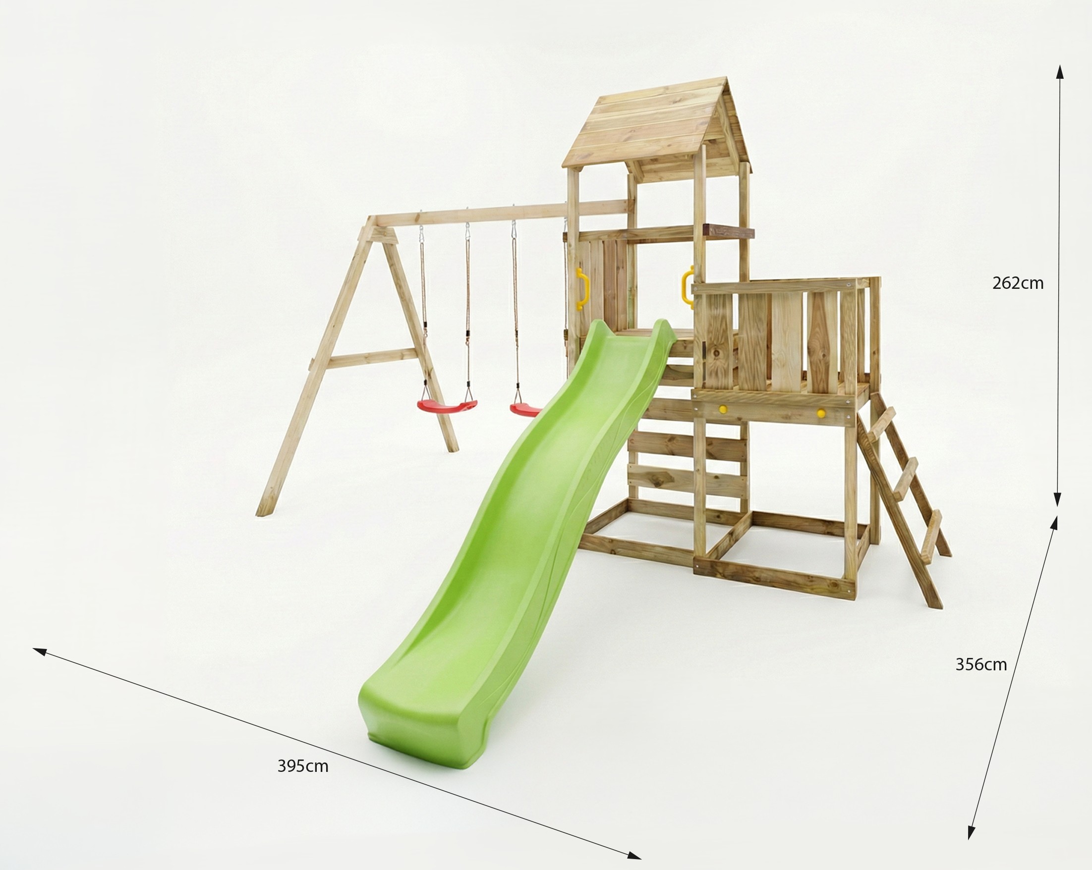 - Kurzinfo: Spielturm MaxPlay 3.2 aus kesseldruckimprägniertem Holz mit 2 Podeste, Holzdach, Doppelschaukel, Leiter, Kletterwand, grüner Rutsche, Schaukelsitze und Bodenanker, Länge der grünen Rutsche: 220 cm, Aufbaumaße: B x L x H: 395 x 356 x 262 cm, Schaukelbalken oben Stärke: 9 x 9 cm, Podesthöhe Spielturm: 120 cm, Größe Plattform Spielturm: 80 cm x 80 cm, Podesthöhe Anbau am Spielturm: 90 cm, Größe Plattform Anbau am Spielturm : 75 cm x 80 cm